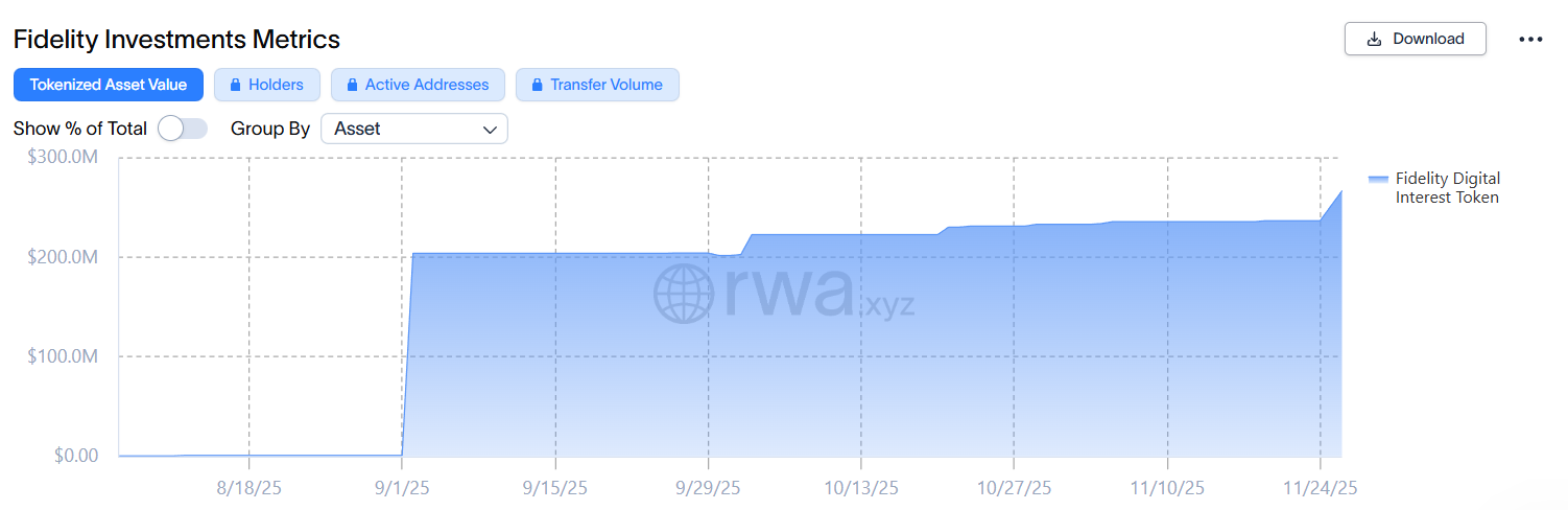 Fidelity's tokenized fund on Ethereum has climbed to $266.2 million, up 15% over the past month, according to RWAxyz. The move underscores how real-world assets (RWAs) like U.S. Treasuries are quickly shifting on-chain.