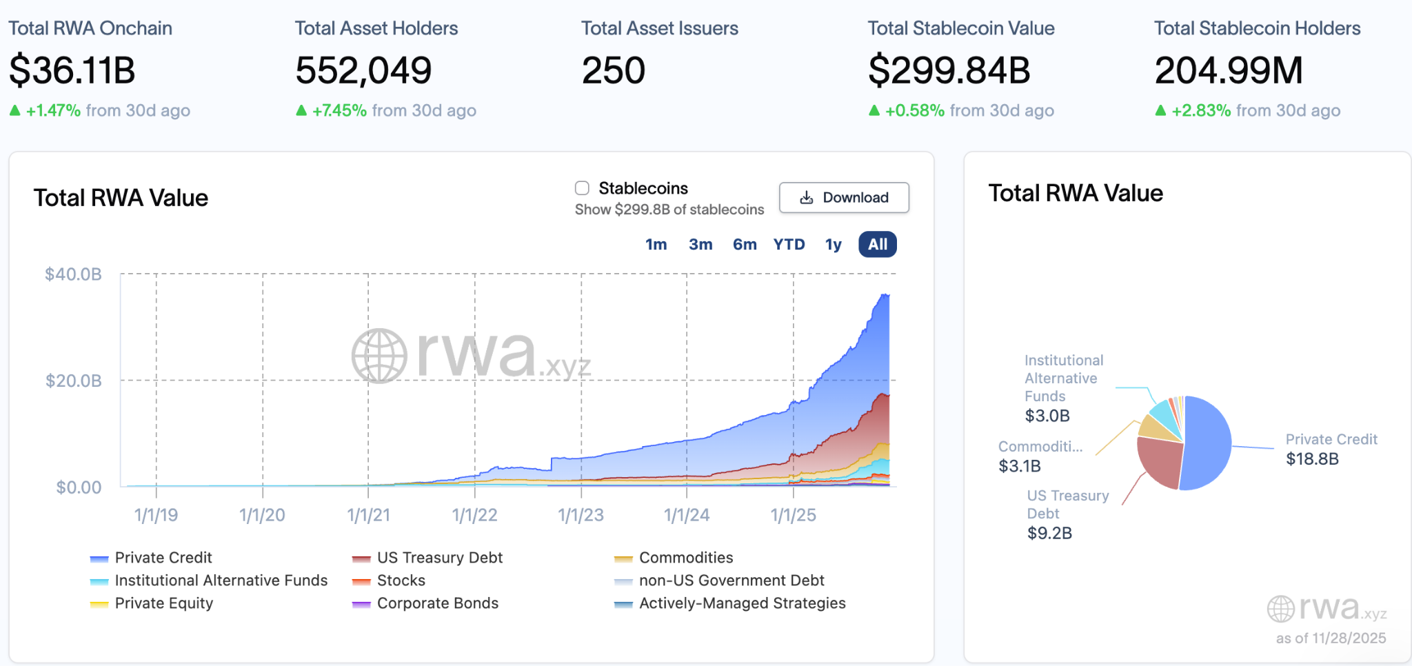 RWAs on public blockchains now exceed $36 billion in represented value, more than doubling since the start of the year, per RWAxyz. Private credit is the largest slice at about $18.7 billion. Ethereum is still the top chain for these assets, with roughly $11.6 billion, about 63.7% of the sector's total.